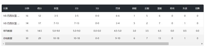 對(duì)陣巴西G2,全場(chǎng)比賽14分鐘,13中7,罰球4中3,拿到17分7籃板,命中率53.8%。